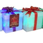 Set of 4 light up presents with LED colour changing lights. Includes 4 colours – green, purple, red and blue. Each present measures approx. 10cm x 10cm x 10cm. Battery operated (batteries included).