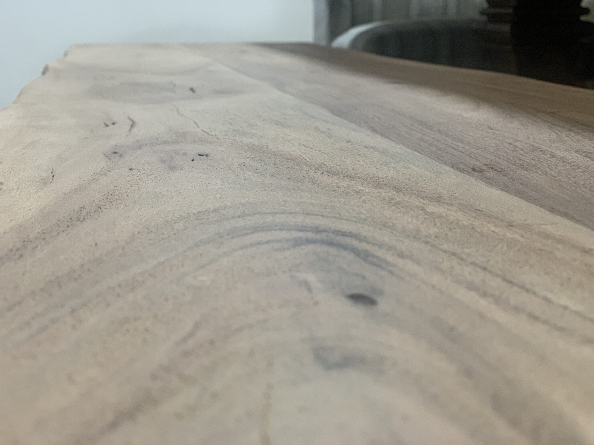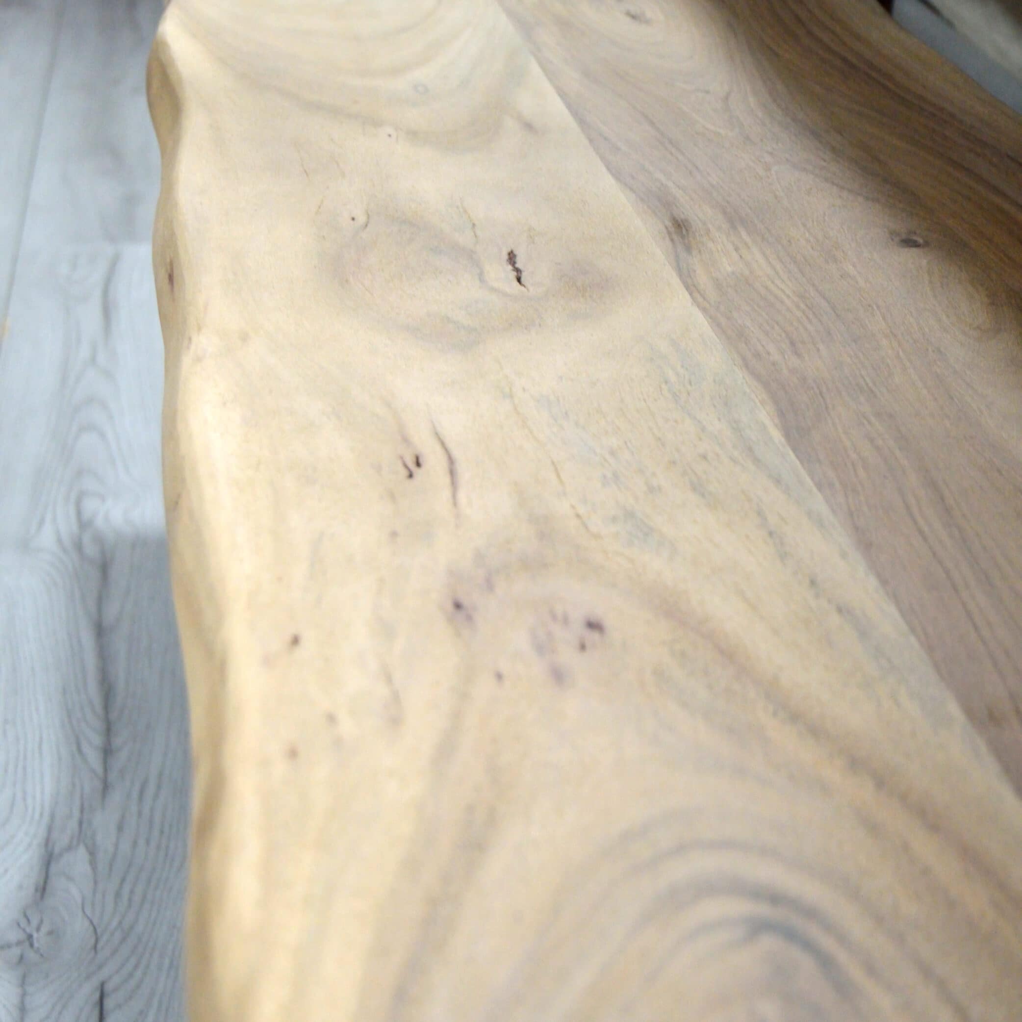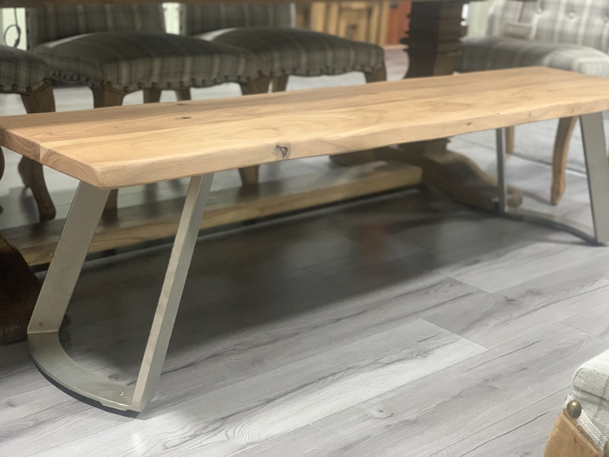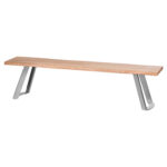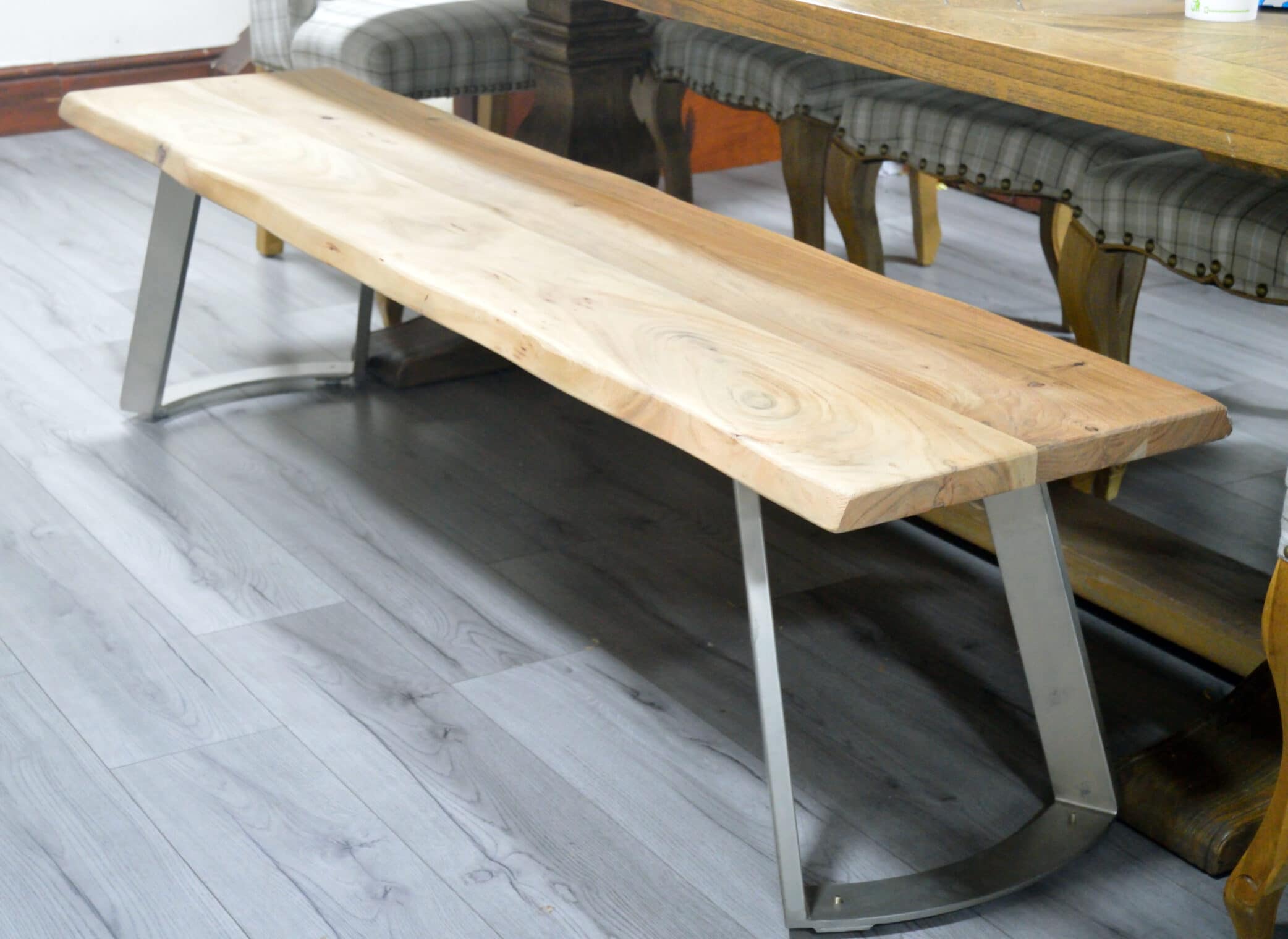 This is the Live Edge Collection Sandblasted Dining Bench. The sandblasting technique enables us to give these stunning new additions to the popular Live Edge range a thinner coating of oil, delivering a lighter colour tone to the wood and an even more textured and natural appearance.Made from hard-wearing Indian acacia wood, this range helps you to bring a feel of the outdoors in by creating a minimal and earthy look. The simplicity of these designs is what makes them so impressive – each piece is complete with a grey metal cross leg design or frame which complements the rustic and natural design of the wood. The live edge feature brings an eye-catching design to these pieces and highlights the handmade beauty and authenticity of these products.