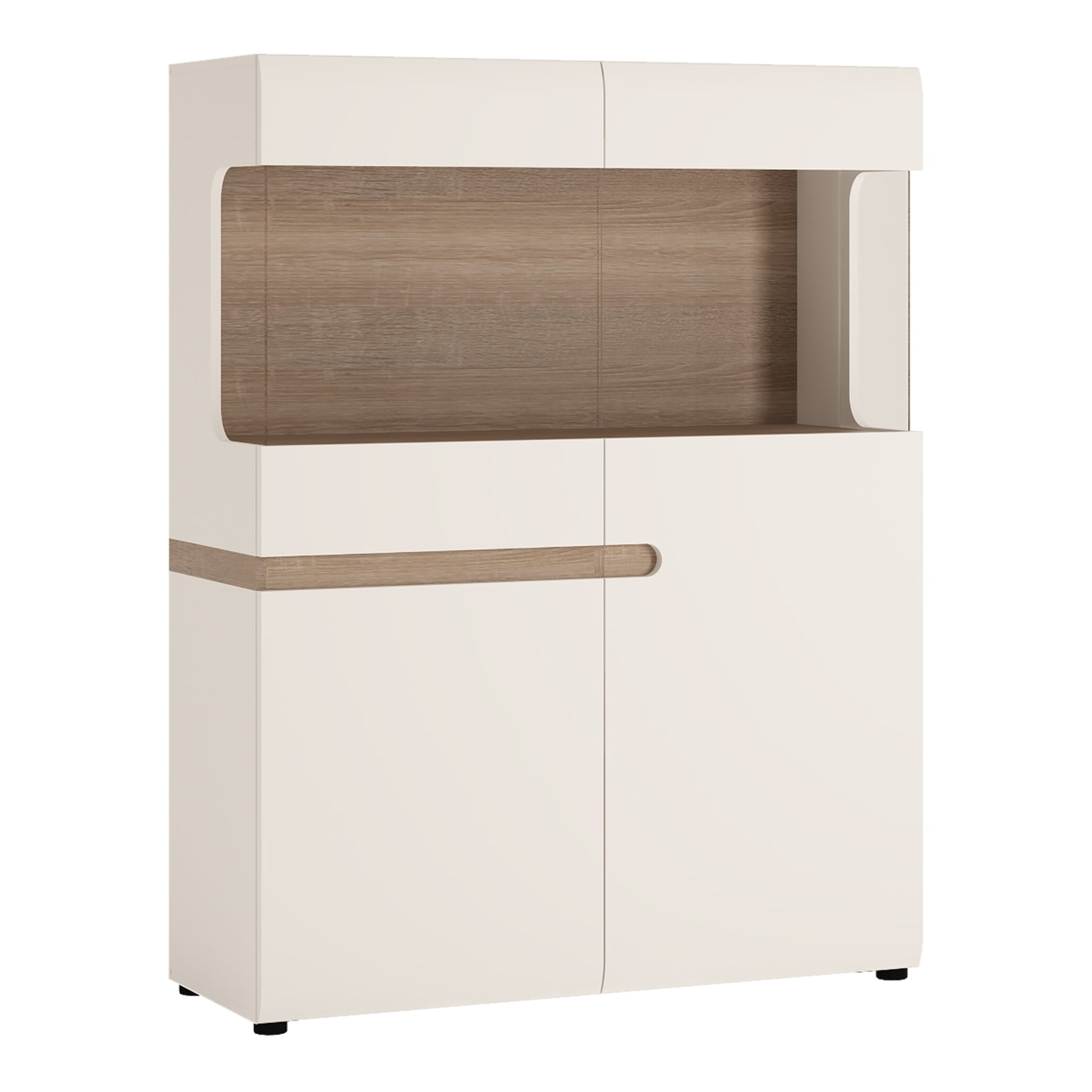 Low Display Cabinet 109 cm wide in white with an Oak Trim. Unconventional design – a proposal for the followers of the latest trends. The clever mix of scratch resistant white melamine with beautiful high gloss fronts and oak melamine trim makes this top quality collection of furniture the ideal destination for the most modern of homes, the massive range that includes many cabinets and wall units fulfils every storage and display option.