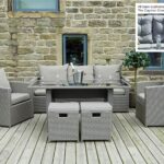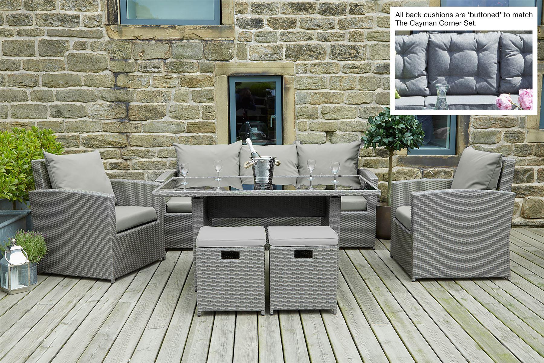 Combine dining and relaxing with our collection of Relaxed Dining Sets. This Cayman Relaxed Dining Set features comfortable seating including 2 Arm Chairs, a 3 Seater Sofa and 2 additional Footstools, which slide out from underneath the glass-topped Dining Table. Very comfortable for dining, this set is also ideal for simply relaxing in the sun and is UV/weather protected. DINING TABLE – 145X85X68CM HIGH CHAIR – 74X74X84CM HIGH 3 SEATER SOFA – 118X74X84CM HIGH FOOTSTOOLS 40X40X42CM HIGH