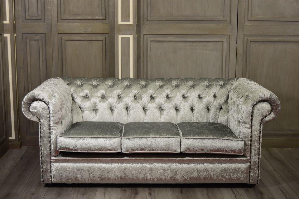 Luxury Soft Crushed Velvet Style Fabric Chesterfield Sofa Colour: Shimmer Silver This 3 Seater Sofa comes with option of 2 cushions or 3. Two Seaters are also available – Please contact for more details. More Shimmer colour options available: Steel, Pearl, Silver,Mink, Grape, Aqua, Heather, Red, Fuchsia, Midnight, Ebony, Amethyst, Apple, Boysenberry, Forset, Gold, Plum, Stone. IMPORTANT INFORMATION Flame Retardant – These fabrics meet the requirements of Bs5852 Part 1 ignition source 0 (Cigarette) ignition source 1 (Match) as laid out in the Furniture & Furnishings (FIRE) (SAFETY) REGULATIONS 1988 Cleaning – Fabric should be cleaned in situ by a specialist Dry Cleaner who is used to handling this type of material. The sofa will be delivered 7-10 weeks from order