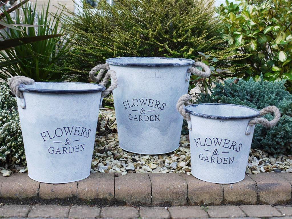 New Set of 3 Garden & Flowers Buckets Distressed Grey Decoration Plant Pots 2116