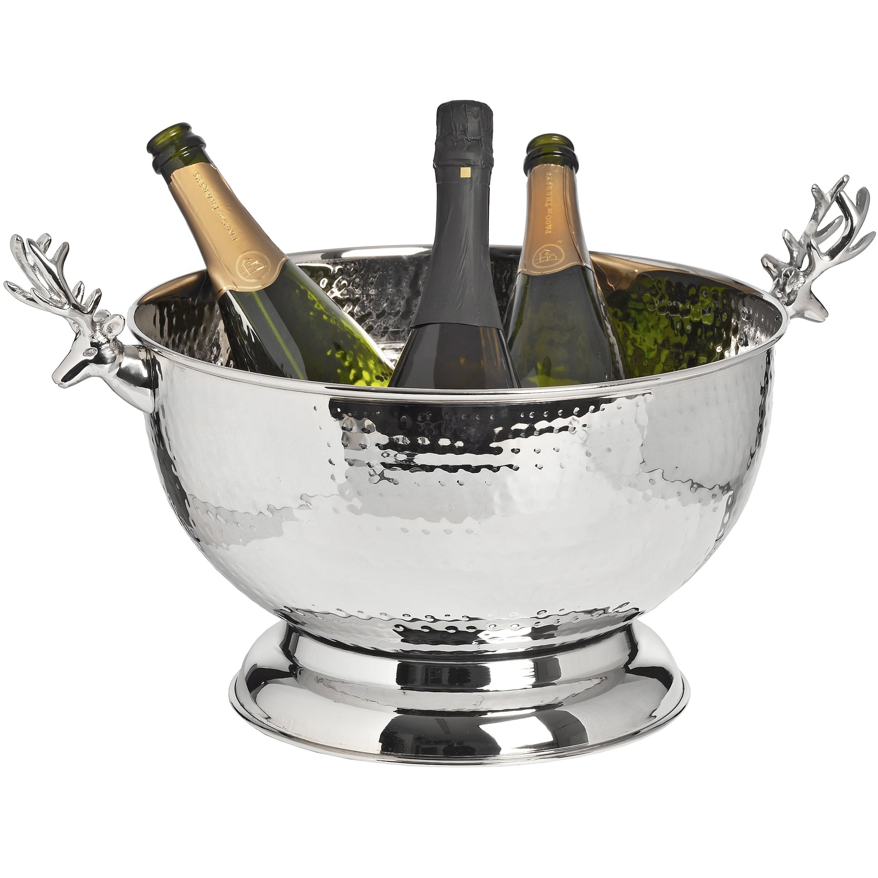 Nickel wine cooler with stag head handles, 36cm diameter.