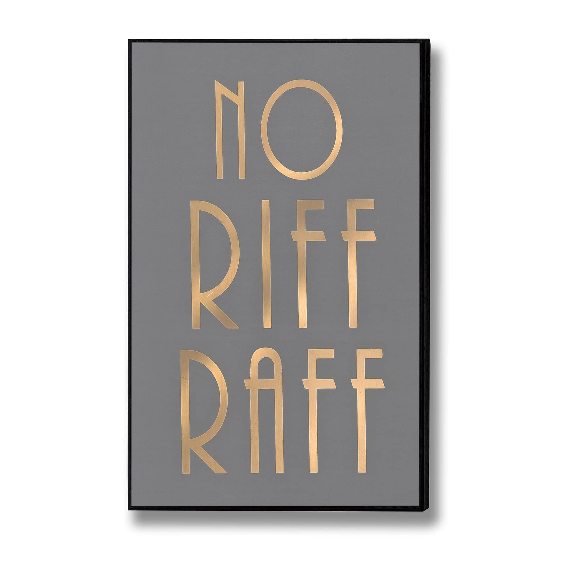 Gold foil lettering in an art deco inspired font spells out ‘No Riff Raff’ against a matt black board. This popular plaque’s high-contrast message is certain not to go unnoticed and provide the odd customer pause for thought! A light-hearted home addition that will have great stand-out instore.