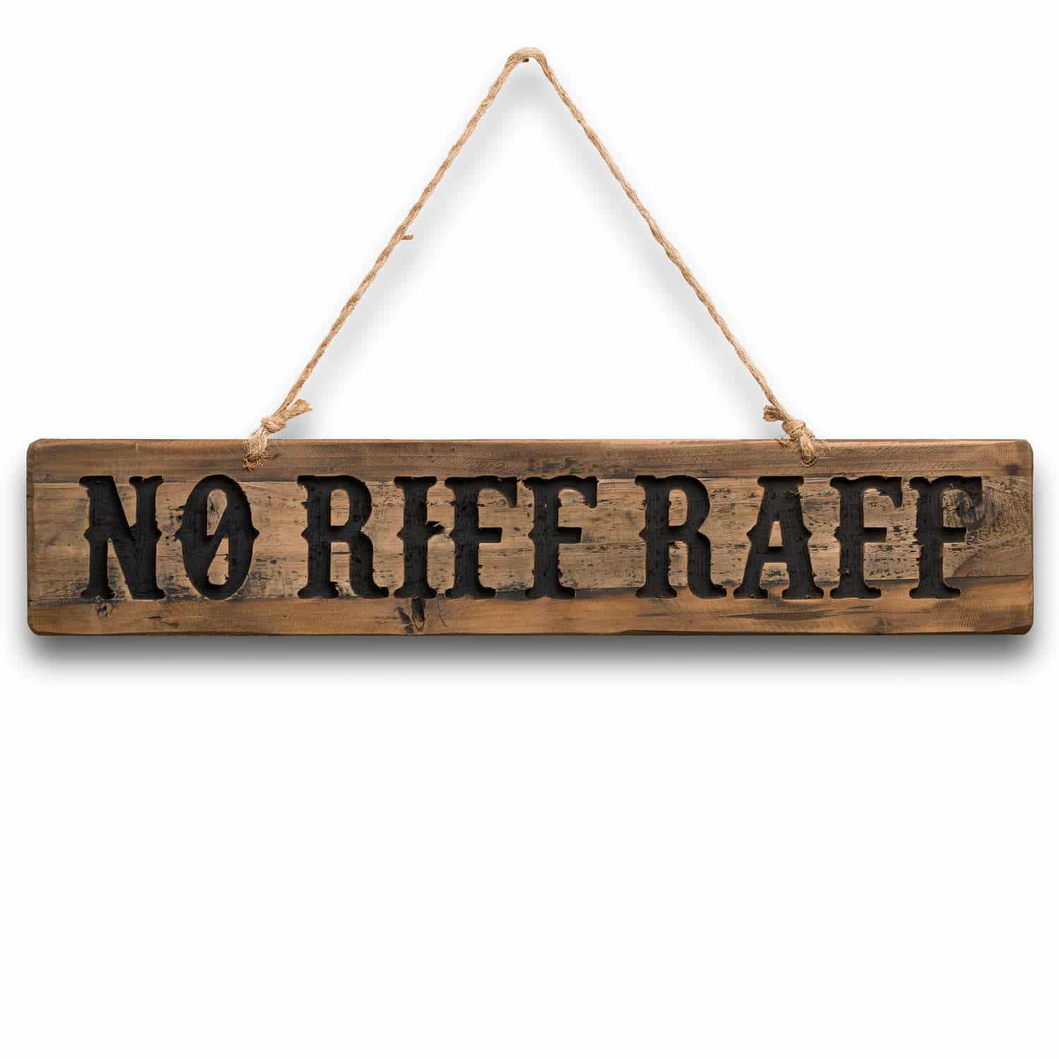 This is the No Riff Raff Rustic Wooden Message Plaque, it features the light-hearted warning of ‘No Riff Raff’. The text has been engraved on a reclaimed pine board in bold lettering to create an attractive and rustic wall feature that is sure to add personality and character to any interior.
