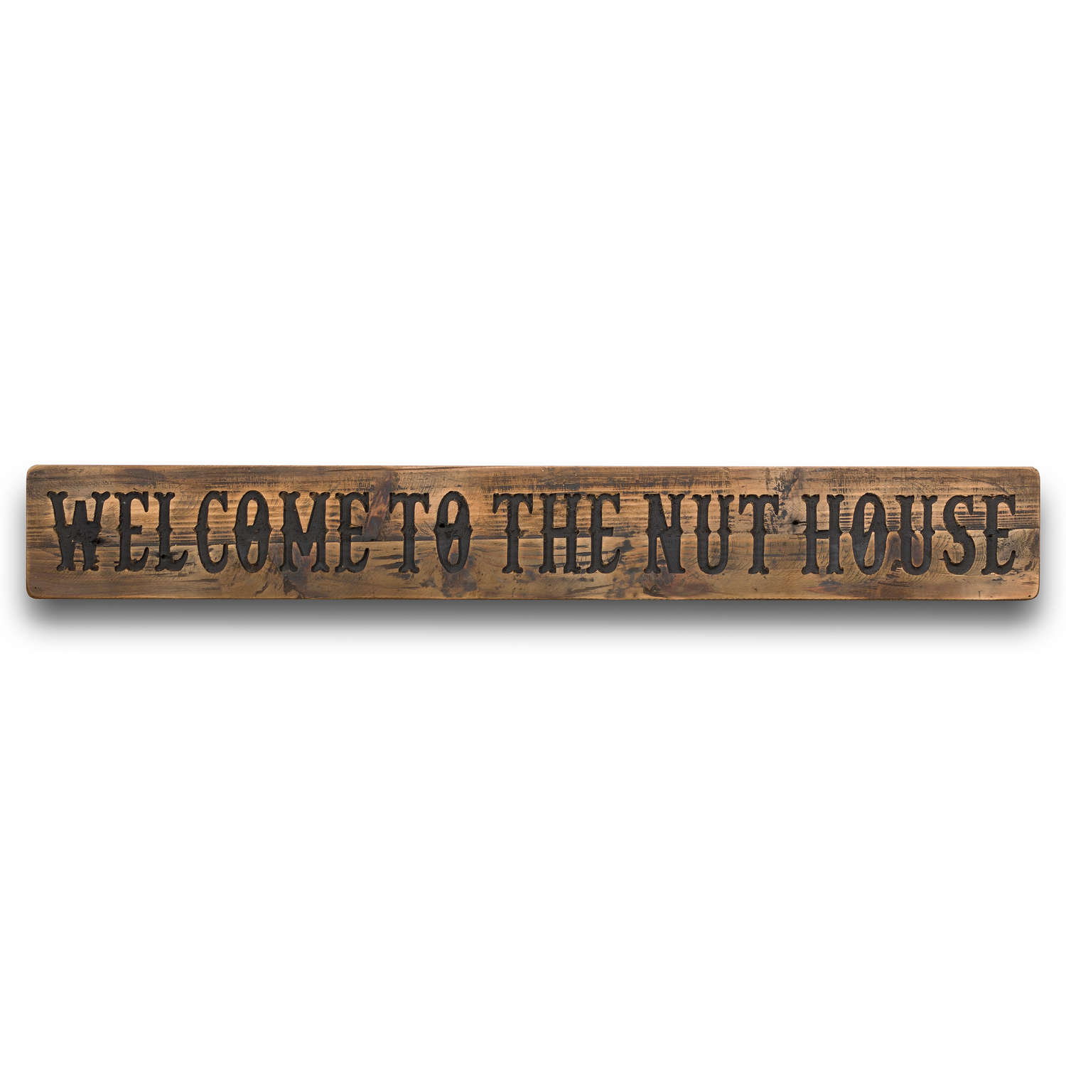 This is the Nut House Rustic Wooden Message Plaque, it features the lighthearted message ‘Welcome To The Nut House’. The text has been engraved on a reclaimed pine board to create an attractive and rustic wall feature that is sure to add personality and character to any interior – ideal for entrances / hallways.