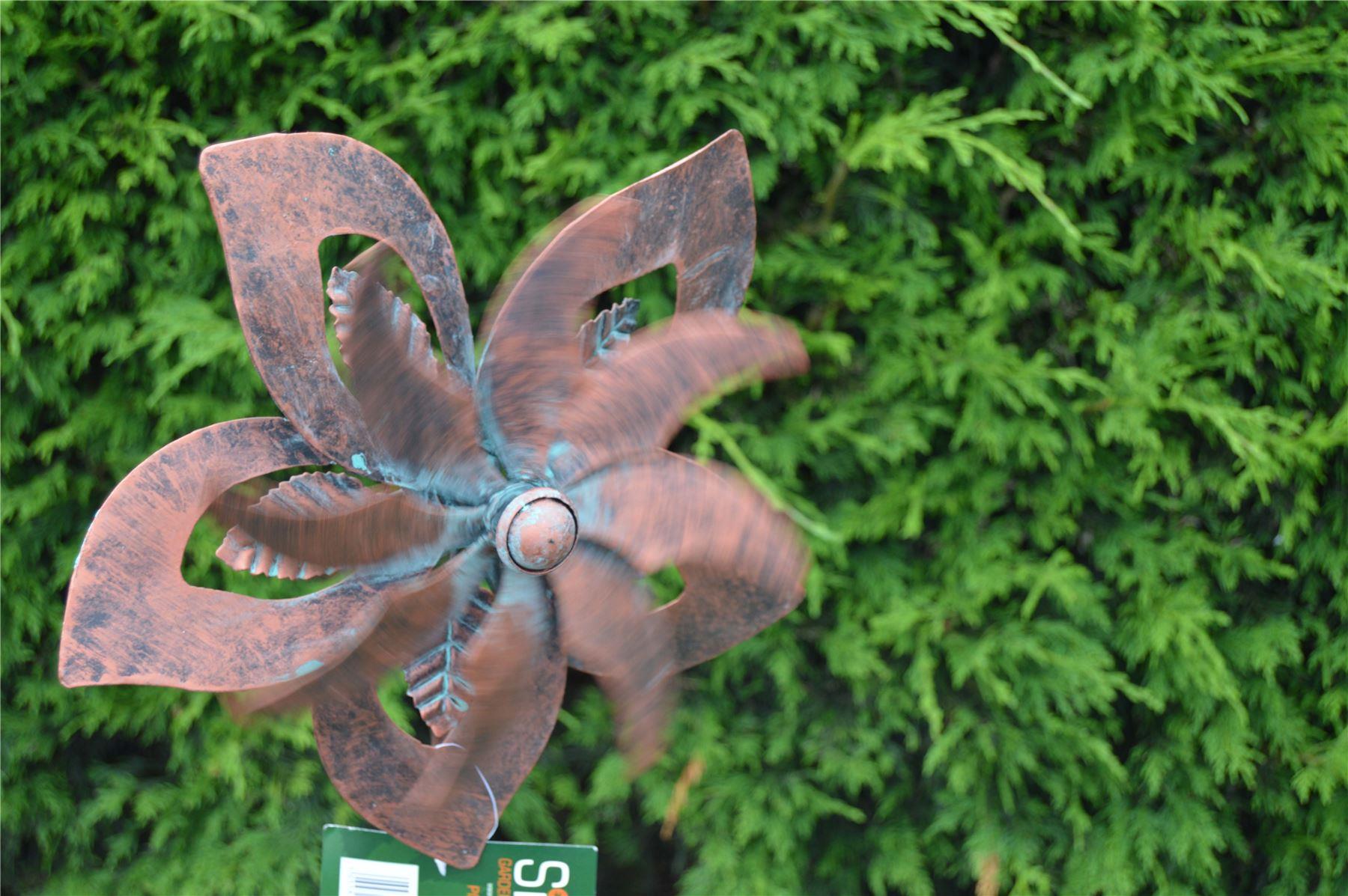 Rustic metal plant insert. The floral windmill design ornament can be placed into the ground with the stakes, and spin in the wind. Dimensions approx: 30 x 13 x 120cm.