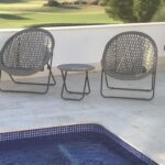 Table and chairs all fold on a grey metal frame. Ideal for packing away over winter months.