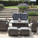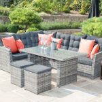 A contemporary relaxed outdoor dining set, the cayman is in a beautiful mixed grey weave, which is UV protected and waterproof. The 7 seat dining set comes with a 2 piece corner sofa, 2 footstools, which can also be used as seats (all with showerproof cushions) amd a tempered glass topped table. The corner set is ideal for daytime and evening relaxed dining. Comfortable, Stylish & durable.