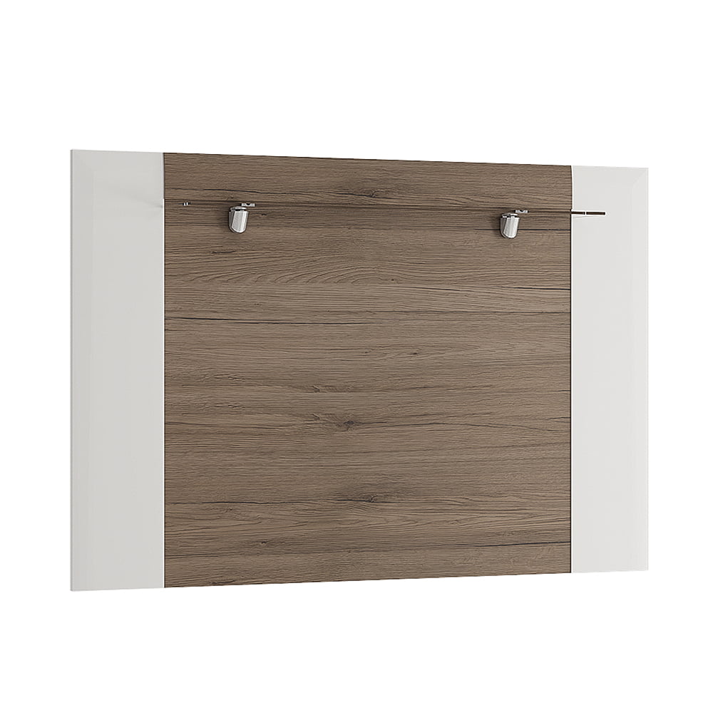 Rear Wall fitting for 140 cm TV Cabinet (inc. Tasma Flex Lighting). Especially designed to fit on top of our extra wide TV cabinet to make the ultimate TV display unit, includes clever concealed lighting. Warm and yet cool living and dining collection in white High Gloss with San Remo Oak inset.