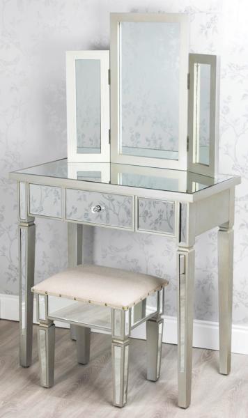 This mirrored 1 drawer dressing table is one of our most popular dressing tables due to its cool and contemporary design. With its spacious drawer and ample table top complete with stool & table top mirror. Depth: 40cm Height: 141cm Width: 80cm