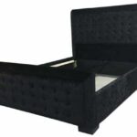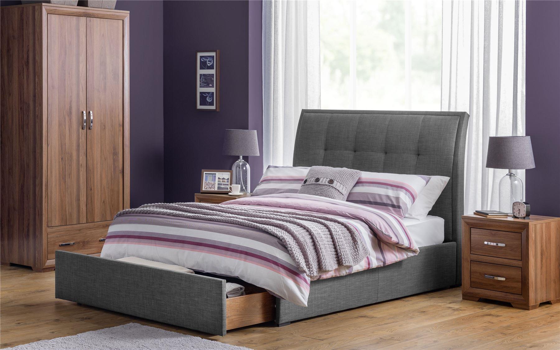 BED IN SLATE GREY LINEN FABRIC WITH SPRUNG SLATTED BASE AND FOOTEND STORAGE DRAWER