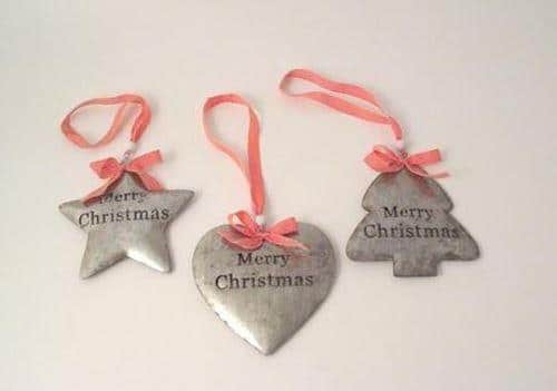 Set of 3 metal hanging tree trims, with ‘Merry Christmas’ cut out of each. The star, heart and tree hang from red and white ribbon with a bow at the top of each. The worn look signs will look perfect on your tree this Christmas. Size of each approx. 16cm, ribbon length 25cm.