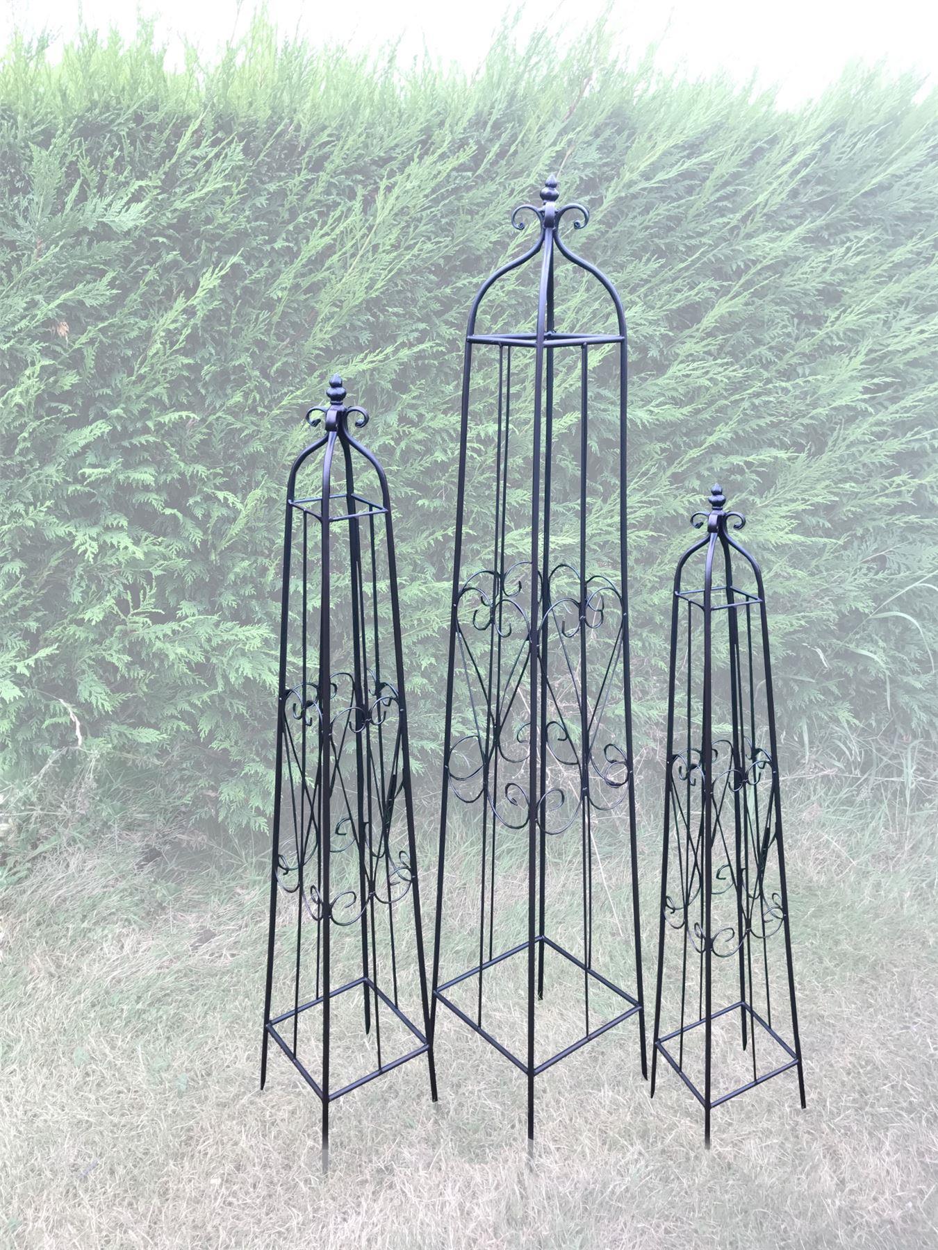 This lovely set of 3 garden obelisks would be an excellent addition to a patio, lawn or flowerbed. The dynamic and timeless design means it will adapt to any setting, standing proud amongst trees and flowers.