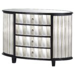 This is the Soho Black Mirror Collection Oval Chest. Designed and manufactured exclusively for Hill Interiors, this collection takes our mirrored furniture offering to new heights of style and modernity. Built in black painted pine and a combination of clear and antique mirror, this item’s striking geometric mirrorwork gives it a real wow-factor, perfect for its intended role as a room’s stand-out statement piece. Metal ball-bearing drawer runners will ensure this item’s durability in the home.