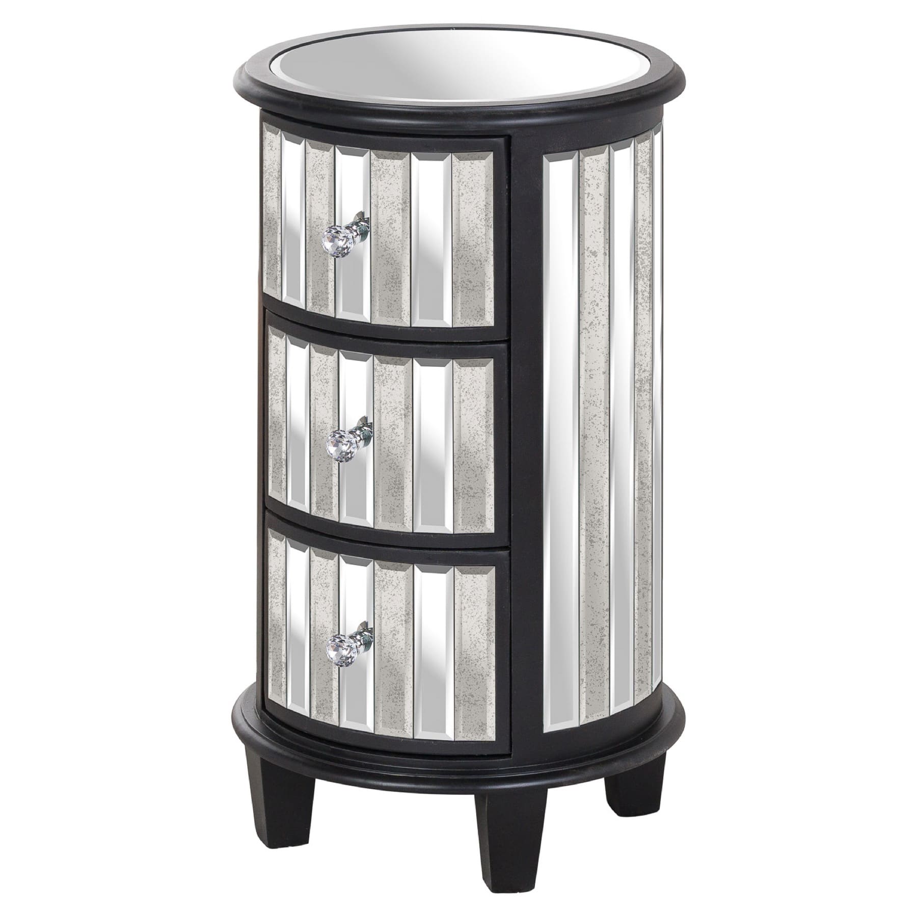 This is the Soho Black Mirror Collection Oval 3 Drawer Unit. Designed and manufactured exclusively for Hill Interiors, this collection takes our mirrored furniture offering to new heights of style and modernity. Built in black painted pine and a combination of clear and antique mirror, this item’s striking geometric mirrorwork gives it a real wow-factor, perfect for its intended role as a room’s stand-out statement piece. Metal ball-bearing drawer runners will ensure this item’s durability in the home.