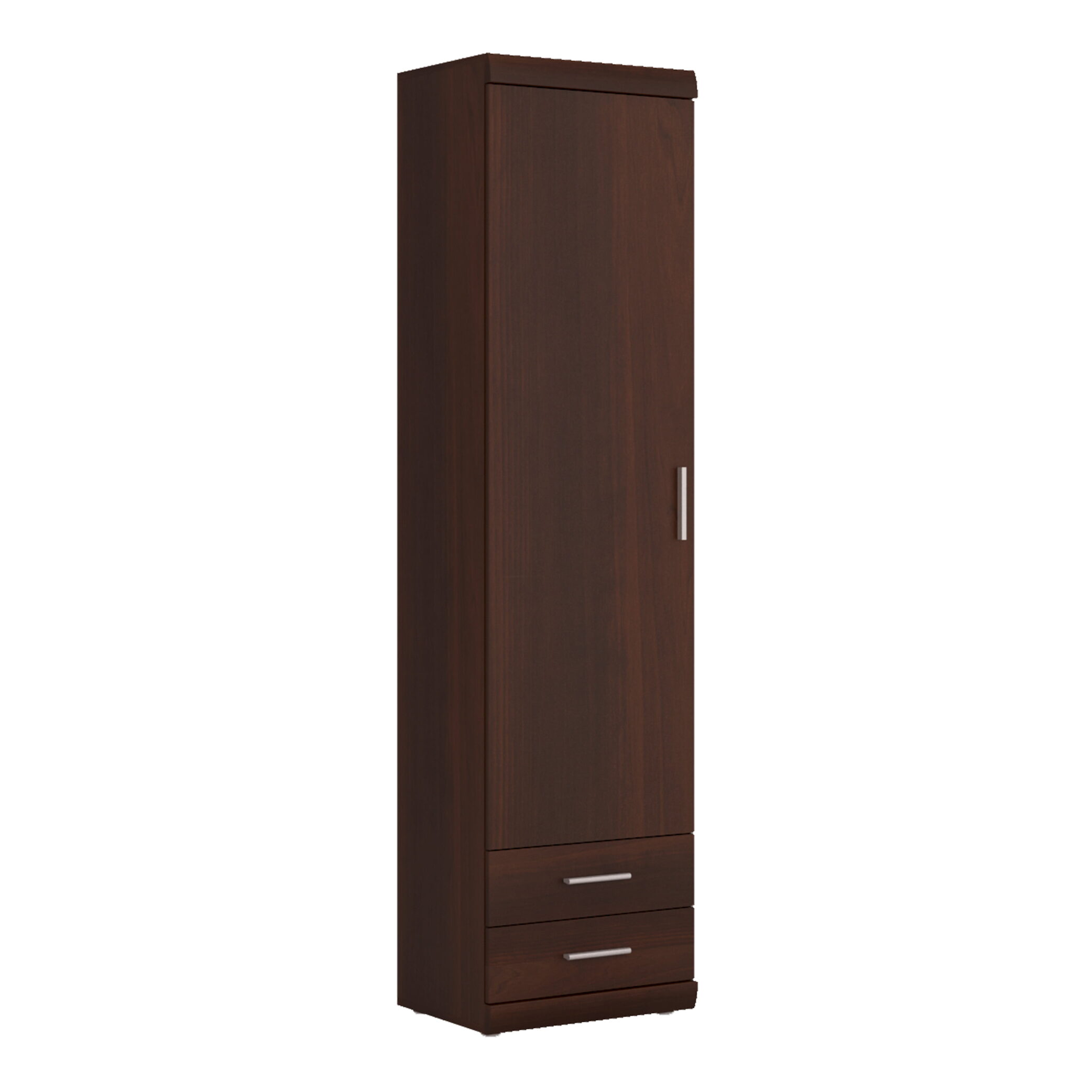 Tall 1 Door 2 Drawer Narrow Cabinet in Dark Mahogany Melamine. This beautiful classic collection offer an elegant and practical room layout. Limited space is no longer a problem as the range offers great storage options. The range is manufactured in dark mahogany melamine with laminated board (resistant to damage and scratching, moisture and high temperatures).