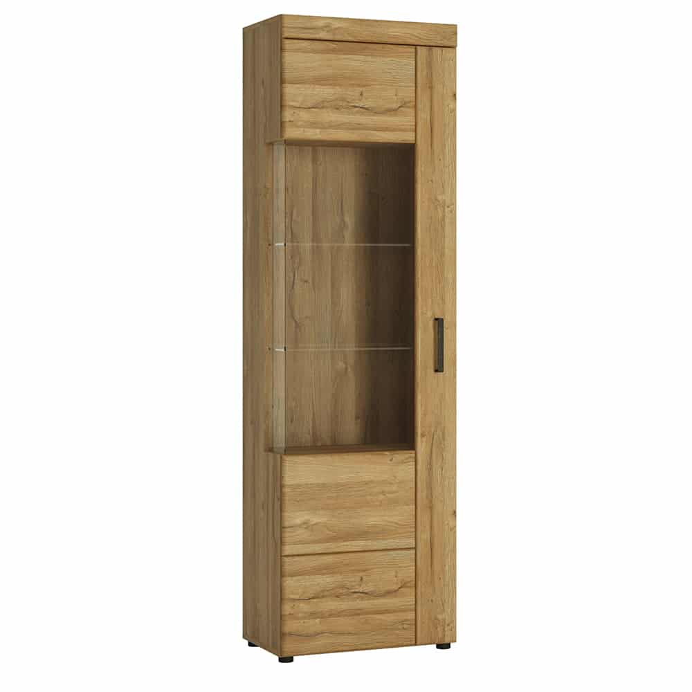 A narrow glazed display cabinet with a total of 5 shelves ? it’s great for the living room or dining room. The glazed front lets you elegantly display both home decorations and porcelain on the 2 glass shelves. For the lovers of natural wood, this range offers you the oppotunity to enjoy the charm of wooden furniture at an affordable price. Made from high quality MDF in the colour of grandson oak, which looks just like natural timber. An additional feature is the beautiful antique metal handles which gives a timeless elegance to the collection.
