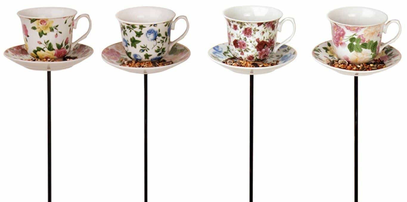 Assortment of teacup and saucer birdfeeders on pole. Bird feed not included.