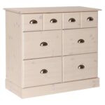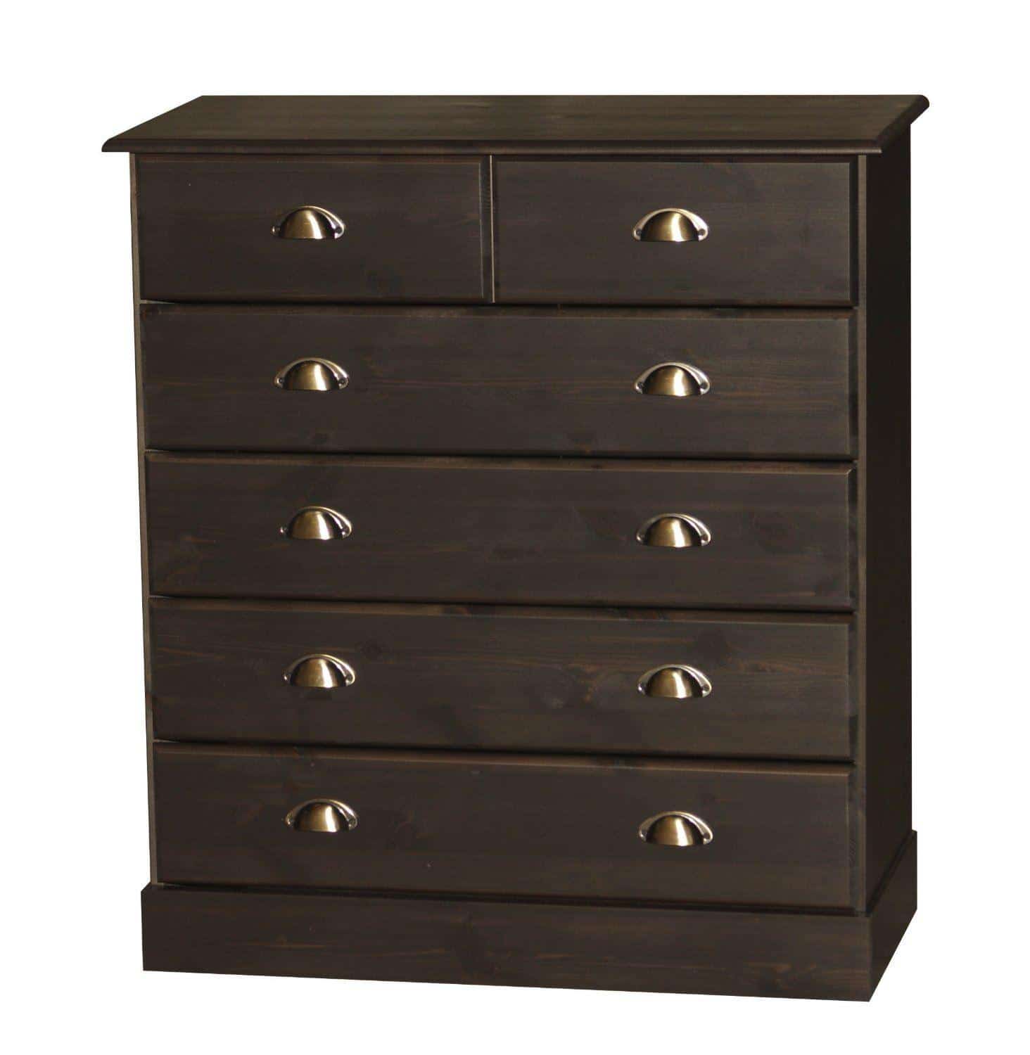 Terra 4+2 drawer in Pine/dark stain lacguer. With 2 smaller drawers over 4 wide make this stylish chest perfect bedroom storage. With smooth gliding drawer runners, brass finished cup handles and cam lok drawer front construction. Made in FSC certified timber and in a rick dark stain finished off with easy clean lacquer.