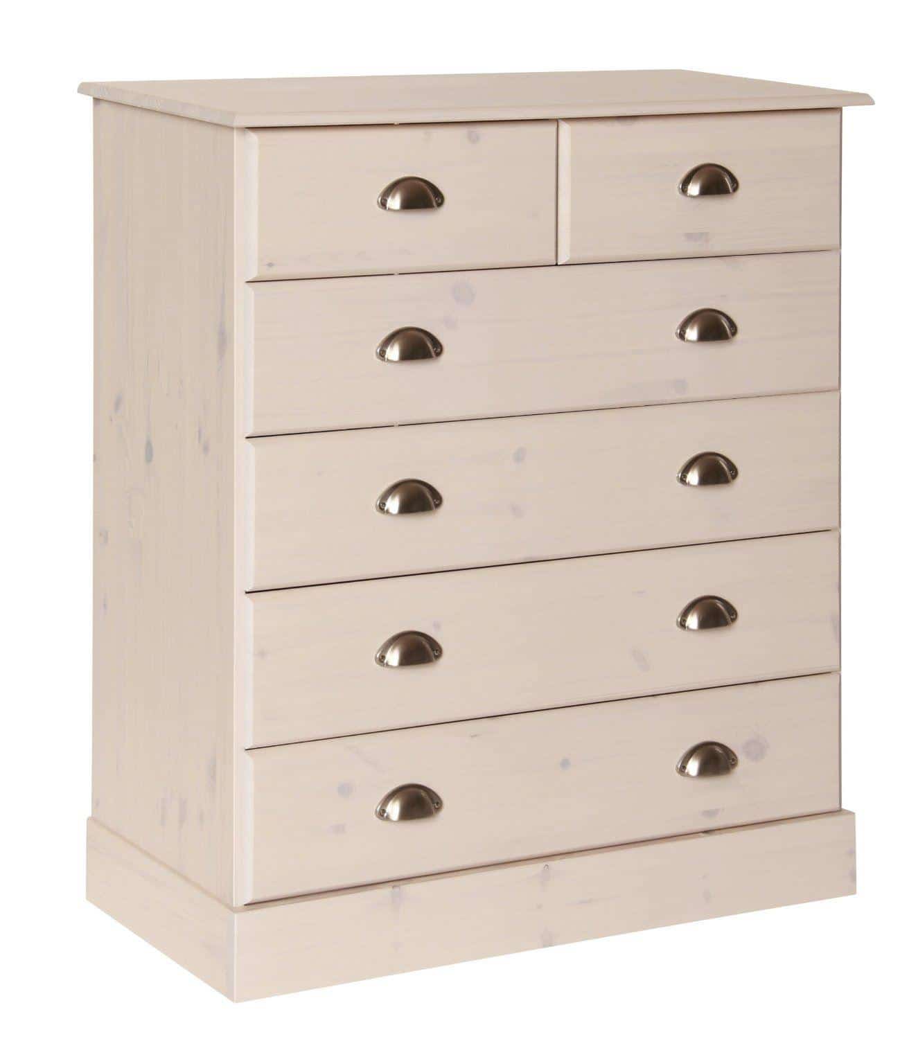 Terra 4+2 drawer in Pine/white. With 2 smaller drawers over 4 wide make this stylish chest perfect bedroom storage. With smooth gliding drawer runners, brass finished cup handles and cam lok drawer front construction. Made in FSC certified timber and finished with a white wash stain.