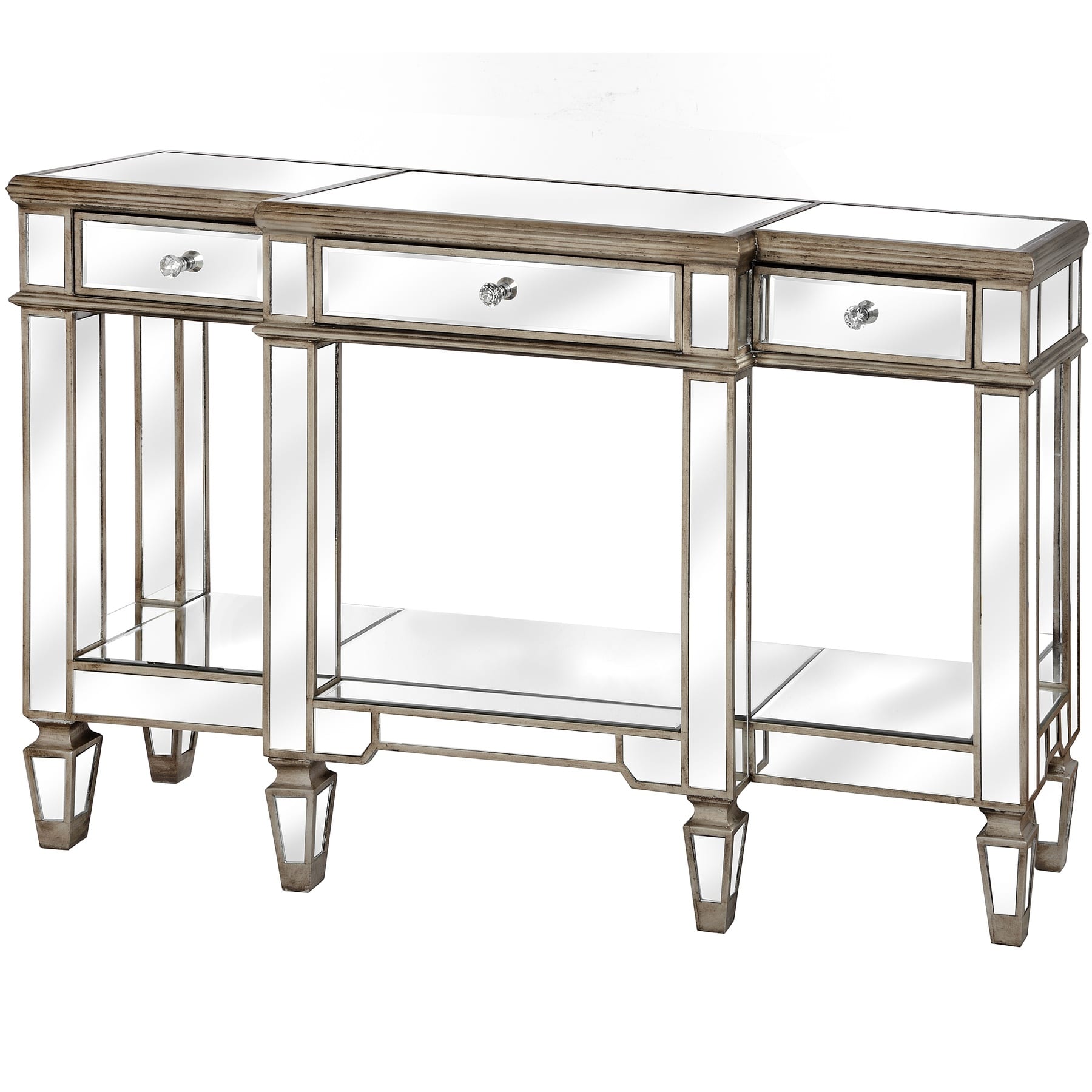This is The Belfry Collection Mirrored Display Console, handcrafted to utmost perfection the Belfry Collection brings world class into any interior. This stunning mirrored piece features champagne detailing adding a timeless luxury to any space.The Belfry Collection Mirrored Display Console would make a stunning part of any room. Along with the lower shelves, this console also incorporates three drawers making it perfect for storage too.
