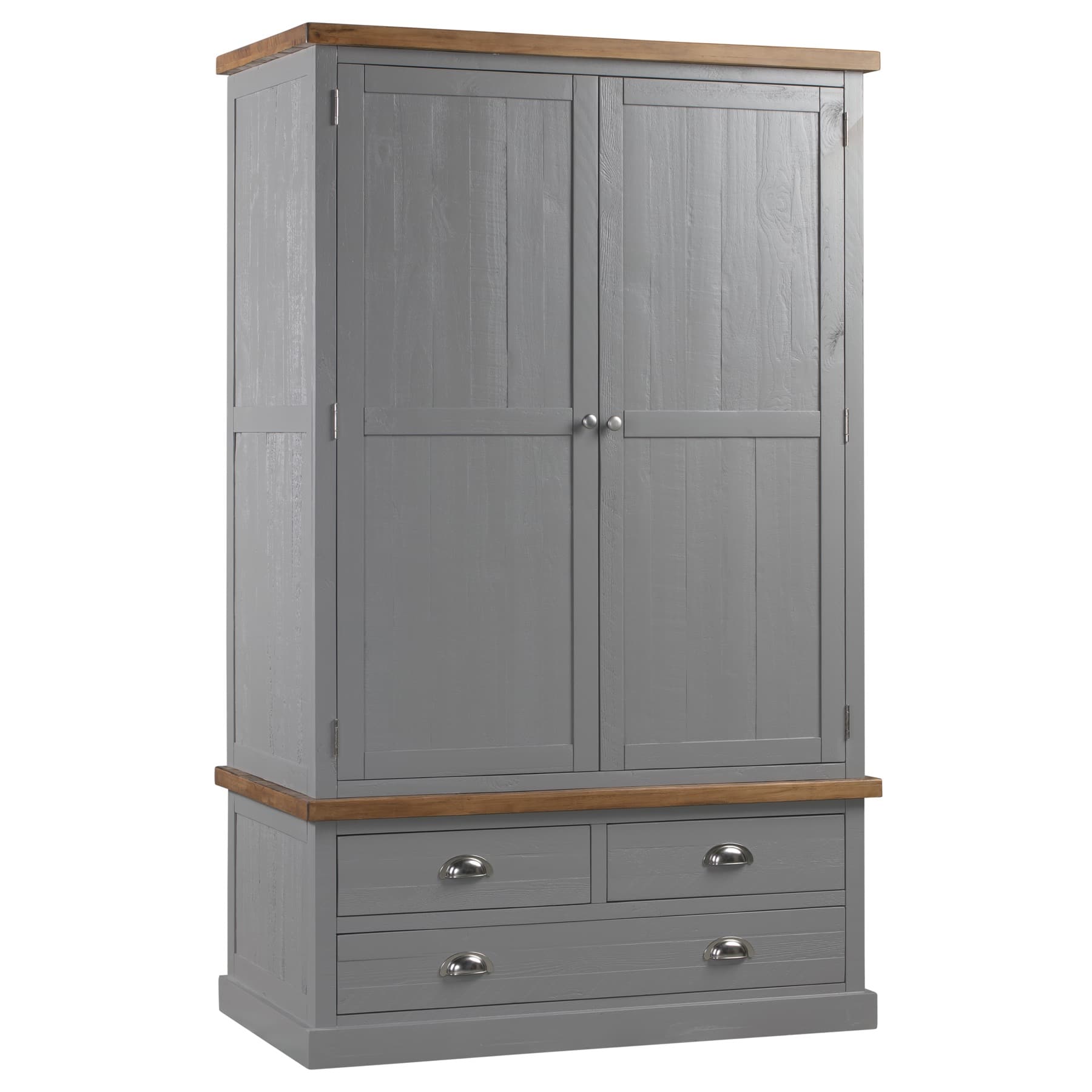 This is the Byland Collection Three Drawer Two Door Wardrobe, a must have item for any bedroom providing storage and space in a stylish way. Finished in a warm grey hue that has been lightly painted allowing for the wood grain to be seen beneath, along with natural pine features and silver handles to create a look that is both easy to accessorised and timeless in style.