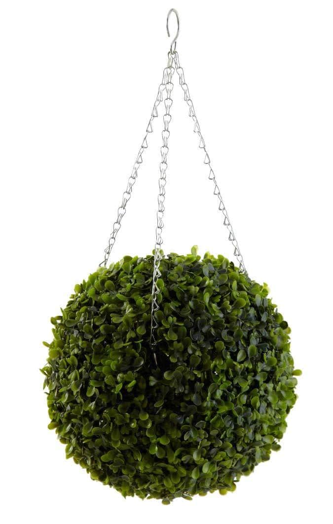 Green coloured leaf effect topiary ball is pre assembled, and hangs from a galvanised removable chain. UV and weather resistant for all year round use. Looks great in borders or pots. Diameter 40cm.